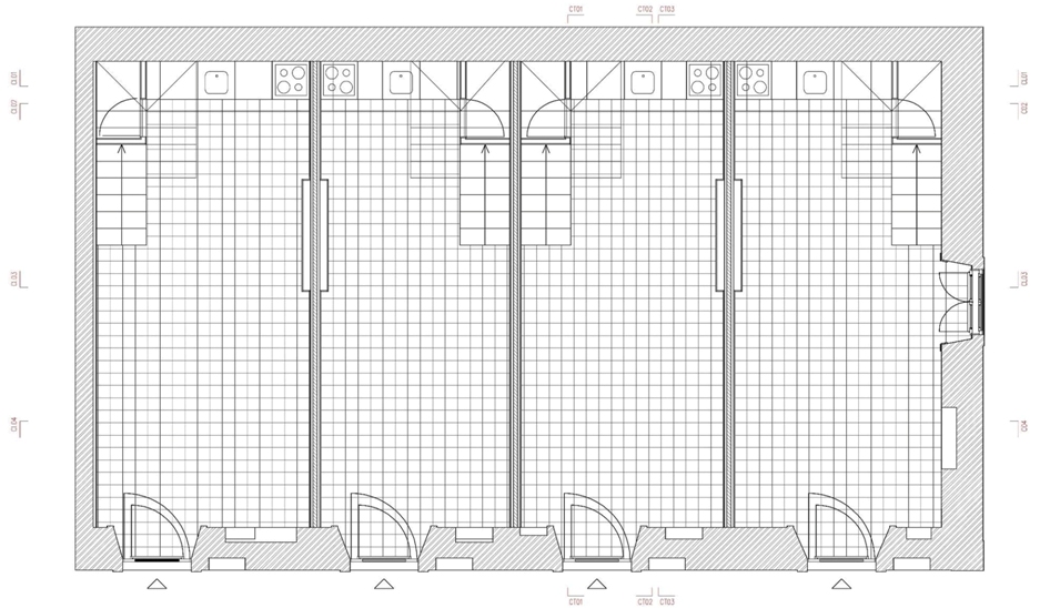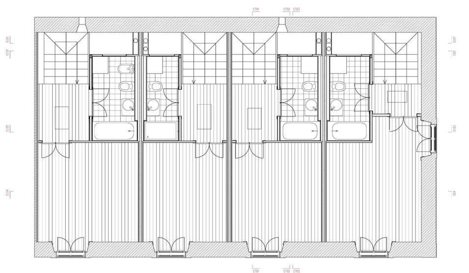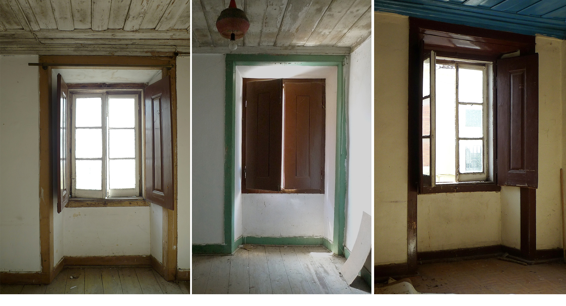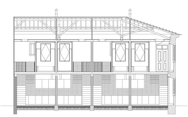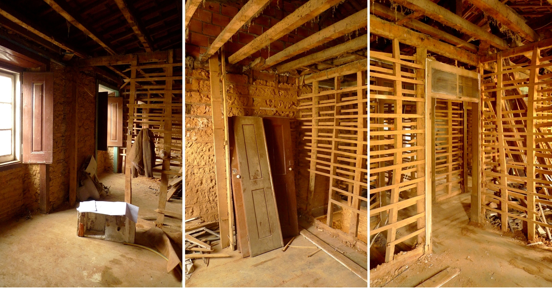 “As quatro casas que foram e serão, mais uma vez, fechadas com paredes, são, por um breve momento, um único espaço em camadas, filtrado pelo entrelaçado em madeira que compõe a estrutura das paredes.